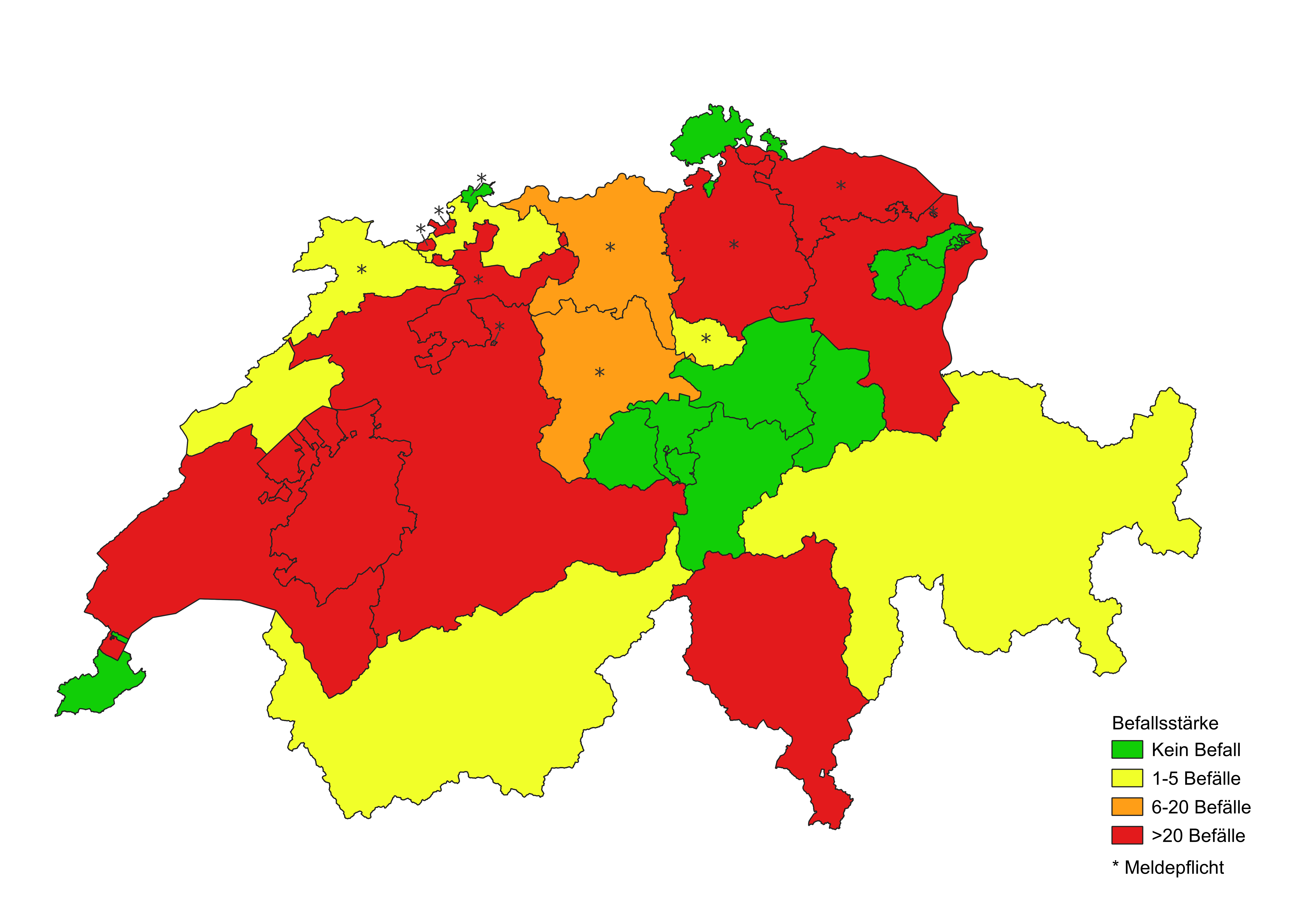 Vous trouverez ici la carte actuelle des infestations de souchet comestible dans les cantons en 2024.
